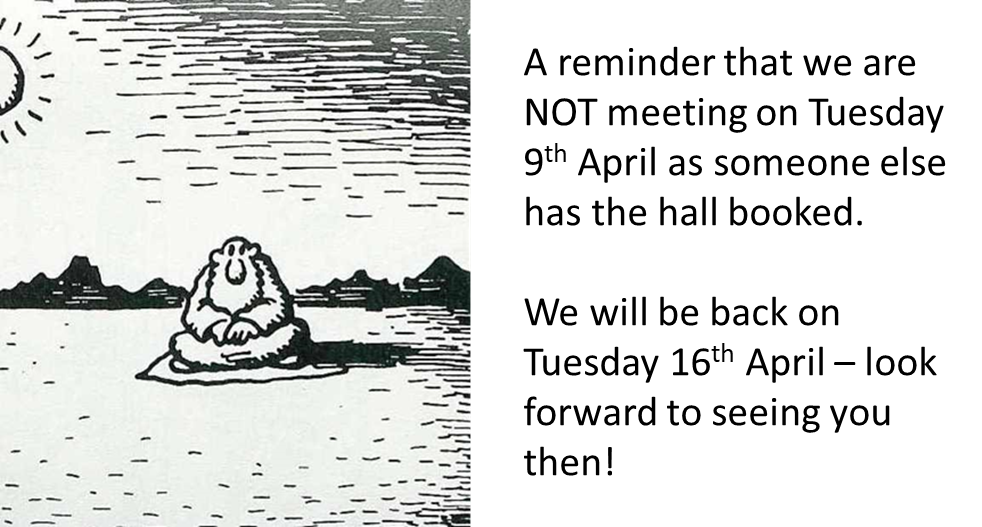 A reminder that this coming Tuesday (June 13th) there will NOT be a meditation session at Simpson Village Hall. However, the good news is that we will be back on Tuesday 20th June – so look forward to seeing you then!